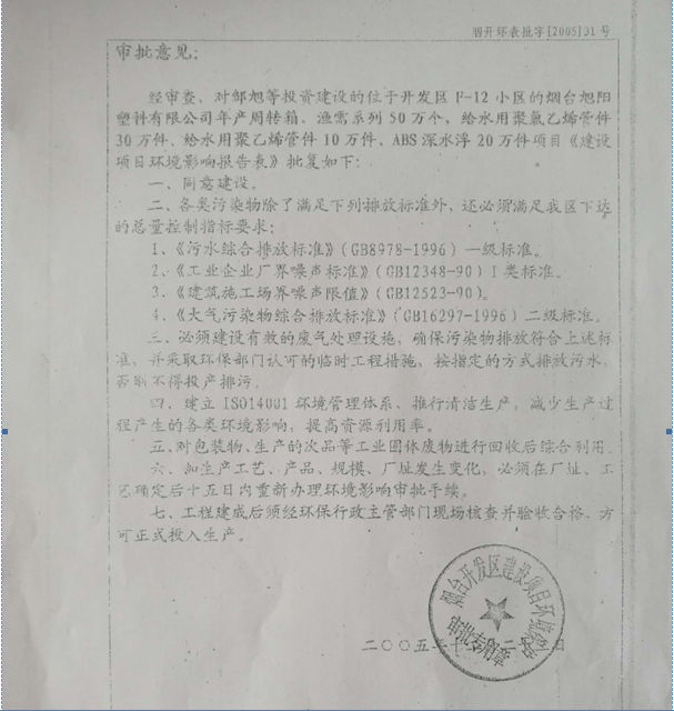 1、環(huán)保審批手續(xù)及“三同時(shí)”執(zhí)行情況 根據(jù)國(guó)家《建設(shè)項(xiàng)目環(huán)境保護(hù)管理?xiàng)l例》中的有關(guān)規(guī)定,2005年11月由煙臺(tái)市環(huán)境保護(hù)科學(xué)研究所對(duì)該項(xiàng)目進(jìn)行了環(huán)境影響評(píng)價(jià),編制完成了《煙臺(tái)旭陽塑料有限公司年產(chǎn)周轉(zhuǎn)箱、漁需系列50萬個(gè),給水用聚氯乙烯管件30萬件,給水用聚乙烯管件10萬件,ABS深水浮20萬件項(xiàng)目環(huán)境影響報(bào)告表》,2005年12月23日,煙臺(tái)市開發(fā)區(qū)環(huán)境保護(hù)局對(duì)該報(bào)告表進(jìn)行了批復(fù)(煙開環(huán)表批字[2015]31號(hào))。 該項(xiàng)目在建設(shè)過程中,基本執(zhí)行了國(guó)家有關(guān)環(huán)保法律法規(guī)的要求,按照環(huán)評(píng)批復(fù)要求進(jìn)行設(shè)計(jì)、施工和試生產(chǎn),滿足了環(huán)保設(shè)施與主體工程同時(shí)設(shè)計(jì)、同時(shí)施工、同時(shí)投產(chǎn)使用的“三同時(shí)”要求。 2、環(huán)境管理規(guī)章制度的建立及其執(zhí)行情況 按照各級(jí)環(huán)保部門要求,煙臺(tái)旭陽塑料有限公司認(rèn)真落實(shí)環(huán)境保護(hù)工作責(zé)任制,完善環(huán)保制度,制訂了環(huán)境保護(hù)管理制度,規(guī)定了環(huán)境保護(hù)機(jī)構(gòu)與管理職責(zé)、環(huán)保設(shè)施管理規(guī)定、污染事故管理。各環(huán)保設(shè)施崗位運(yùn)行維護(hù)情況均建立了有關(guān)記錄,將環(huán)保管理具體責(zé)任落實(shí)到人。 3、環(huán)保機(jī)構(gòu)設(shè)置、人員的配置情況 煙臺(tái)旭陽塑料有限公司實(shí)行環(huán)境保護(hù)責(zé)任制,環(huán)境安全由設(shè)備部主管,配備兼職環(huán)保人員1名負(fù)責(zé)企業(yè)治污,組織本單位職工專業(yè)技能培訓(xùn),確保職工按照崗位操作規(guī)程進(jìn)行操作,避免因錯(cuò)誤或習(xí)慣性操作引發(fā)環(huán)境污染事故。 4、環(huán)保設(shè)施運(yùn)行調(diào)查,維護(hù)情況 煙臺(tái)旭陽塑料有限公司在重要環(huán)保崗位均建立了環(huán)保設(shè)施運(yùn)行報(bào)表,編制設(shè)施操作規(guī)程和崗位標(biāo)準(zhǔn),環(huán)保設(shè)施規(guī)范操作。同時(shí)公司對(duì)環(huán)保設(shè)施實(shí)行檢查、總結(jié)、統(tǒng)計(jì)。確保環(huán)保設(shè)施、設(shè)備與生產(chǎn)系統(tǒng)同時(shí)投用、同時(shí)運(yùn)行。 5、環(huán)境風(fēng)險(xiǎn)防范情況 本項(xiàng)目主要原料為聚乙烯、聚丙烯塑料,其風(fēng)險(xiǎn)主要為火災(zāi)。對(duì)此,建設(shè)單位制定強(qiáng)化 了安全生產(chǎn)及環(huán)境保護(hù)意識(shí)的教育,定期對(duì)操作人員進(jìn)行安全生產(chǎn)、消防、環(huán)保、工業(yè)衛(wèi)生等方面的技術(shù)培訓(xùn)教育;定期對(duì)消防設(shè)施檢查,保證消防設(shè)施的有效性。 ![]() |